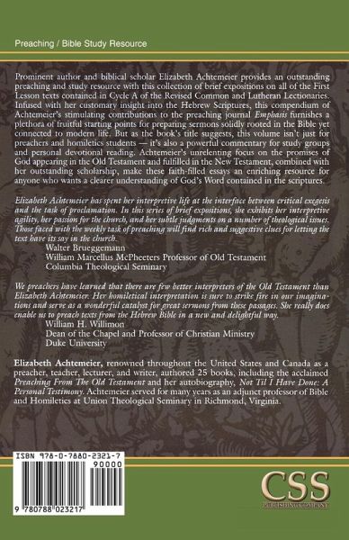 Prominent author and biblical scholar Elizabeth Achtemeier provides an outstanding preaching and study resource with this collection of brief expositions on all of the First Lesson texts contained in Cycle A of the Revised Common and Lutheran Lectionaries. Infused with her customary insight into the Hebrew scriptures, this compendium of Achtemeier's stimulating contributions to the preaching journal Emphasis furnishes a plethora of fruitful starting points for preparing sermons solidly rooted in the Bible yet connected to modern life. But as the book's title suggests, this volume isn't just for preachers and homiletics students -- it's also a powerful commentary for study groups and personal devotional reading. Achtemeier's unrelenting focus on the promises of God appearing in the Old Testament and fulfilled in the New Testament, combined with her outstanding scholarship, make these faith-filled essays an enriching resource for anyone who wants a clearer understanding of God's Word contained in the scriptures. Elizabeth Achtemeier has spent her interpretive life at the interface between critical exegesis and the task of proclamation. In this series of brief expositions, she exhibits her interpretive agility, her passion for the church, and her subtle judgments on a number of theological issues. Those faced with the weekly task of preaching will find rich and suggestive clues for letting the text have its say in the church. Walter Brueggemann William Marcellus McPheeters Professor of Old Testament Columbia Theological Seminary We preachers have learned that there are few better interpreters of the Old Testament than Elizabeth Achtemeier. Her homiletical interpretation is sure to strike fire in our imaginations and serve as a wonderful catalyst for great sermons from these passages. She really does enable us to preach texts from the Hebrew Bible in a new and delightful way. William H. Willimon Dean of the Chapel and Professor of Christian Ministry Duke University Renowned throughout the United States and Canada as a preacher, teacher, lecturer, and writer, Elizabeth Achtemeier authored 25 books, including the acclaimed Preaching From The Old Testament and her autobiography, Not Til I Have Done: A Personal Testimony. Achtemeier served for many years as an adjunct professor of Bible and Homiletics at Union Theological Seminary in Richmond, Virginia.