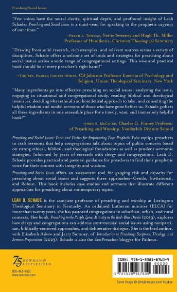 Preaching and Social Issues: Tools and Tactics for Empowering Your Prophetic Voice equips preachers to craft sermons that help congregations talk about topics of public concern based on strong ethical, biblical, and theological foundations as well as prudent sermonic strategies. Informed by years of research with clergy and congregations, Leah D. Schade provides practical and pastoral guidance for preachers to find their prophetic voice for their context with integrity and wisdom. Preaching and Social Issues offers an assessment tool for gauging risk and capacity for preaching about social issues and suggests three approaches-Gentle, Invitational, and Robust. This book includes case studies and sermons that illustrate different approaches for preaching about contemporary topics.