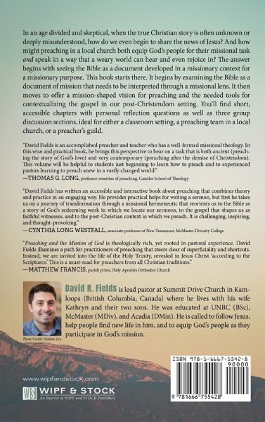 In an age divided and skeptical, when the true Christian story is often unknown or deeply misunderstood, how do we even begin to share the news of Jesus? And how might preaching in a local church both equip God's people for their missional task and speak in a way that a weary world can hear and even rejoice in? The answer begins with seeing the Bible as a document developed in a missionary context for a missionary purpose. This book starts there. It begins by examining the Bible as a document of mission that needs to be interpreted through a missional lens. It then moves to offer a mission-shaped vision for preaching and the needed tools for contextualizing the gospel in our post-Christendom setting. You'll find short, accessible chapters with personal reflection questions as well as three group discussion sections, ideal for either a classroom setting, a preaching team in a local church, or a preacher's guild.