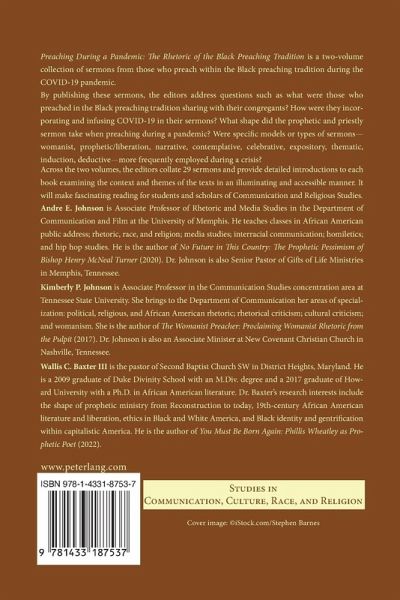 Andre E. Johnson is Associate Professor of Rhetoric and Media Studies in the Department of Communication and Film at the University of Memphis. He teaches classes in African American public address; rhetoric, race, and religion; media studies; interracial communication; homiletics; and hip hop studies. He is the author of No Future in This Country: The Prophetic Pessimism of Bishop Henry McNeal Turner (2020). Dr. Johnson is also Senior Pastor of Gifts of Life Ministries in Memphis, Tennessee. Kimberly P. Johnson is Associate Professor in the Communication Studies concentration area at Tennessee State University. She brings to the Department of Communication her areas of specialization: political, religious, and African American rhetoric; rhetorical criticism; cultural criticism; and womanism. Dr. Johnson has presented her research at professional communication associations such as the National Communication Association, Rhetoric Society of America, Southern States Communication Association, and the Tennessee Communication Association. She is the author of The Womanist Preacher: Proclaiming Womanist Rhetoric from the Pulpit (2017). Wallis C. Baxter III is the pastor of Second Baptist Church SW in District Heights, Maryland. He is a 2009 graduate of Duke Divinity School with an M.Div. degree and a 2017 graduate of Howard University with a Ph.D. in African American literature. Dr. Baxter¿s research interests include the shape of prophetic ministry from Reconstruction to today, 19th-century African American literature and liberation, ethics in Black and White America, and Black identity and gentrification within capitalistic America. He is the author of You Must Be Born Again: Phillis Wheatley as Prophetic Poet (2022).