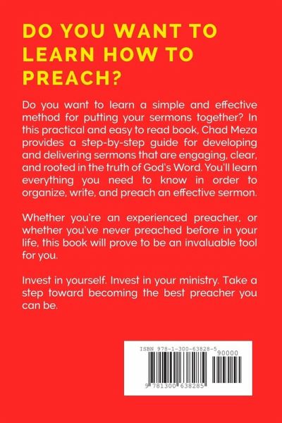 DO YOU WANT TO LEARN HOW TO PREACH? Do you want to learn a simple and effective method for putting your sermons together? In this practical and easy to read book, Chad Meza provides a step-by-step guide for developing and delivering sermons that are engaging, clear, and rooted in the truth of God's Word. You'll learn everything you need to know in order to organize, write, and preach an effective sermon. Whether you're an experienced preacher, or whether you've never preached before in your life, this book will prove to be an invaluable tool for you. Invest in yourself. Invest in your ministry. Take a step toward becoming the best preacher you can be.
