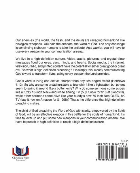 Our enemies (the world, the flesh, and the devil) are ravaging humankind like biological weapons. You hold the antidote: the Word of God. The only challenge is convincing stubborn humans to take the antidote. As a warrior, you will have to use every weapon in your communication arsenal. We live in a high-definition culture. Video, audio, pictures, and crystal-clear messages flood our eyes, ears, minds, and hearts. Social media, the internet, television, radio, and printed content have the potential for either great good or great evil. So what is high-definition preaching? It is simply this: clearly communicating God's word to transform lives, using every weapon the Lord provides. God's word is living and active, sharper than any two-edged sword (Hebrews 4:12). So why are some preachers able to brandish it like a lightsaber, but others seem to swing it around like a butter knife? Why do some sermons come across like a fuzzy 13-inch black-and-white analog TV (buy it now for $10 at Goodwill), while other sermons come alive like your buddy's new 77-inch ultra-high-definition, 4K, OLED TV (buy it now on Amazon for $2,999)? That's the difference that high-definition preaching makes. The child of God preaching the Word of God with clarity, empowered by the Spirit of God, will be an effective weapon in this battle for the souls of humankind. It's time to level up and put some new weapons in your communication arsenal. We have to preach in high definition to reach a high-definition culture.