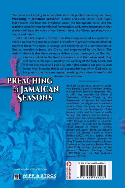 ""So, what am I hoping to accomplish with this publication of my sermons, Preaching in Jamaican Seasons?"" Author and cleric Devon Dick hopes that readers will hear the prophetic voice, the therapeutic voice, and the teaching voice in these homiletical formulations and, more importantly, that readers will hear the voice of our Saviour Jesus, the Christ, speaking to our hearts and minds. Revd Dr Dick explains further that this compilation of his sermons is offered so that they may be a source of comfort to persons who are afflicted, confront those who need to change, and challenge all to a commitment to God as revealed in Jesus, the Christ, and empowered by the Spirit. The author's desire is that these sermons deliver a clear message from God that can be applied to the lived experience; and that when read, they will come to life again, aided by the working of the Holy Spirit, and will not only teach and guide us into righteousness but plant a seed in our lives, knowing that it will accomplish that which God wills, as He gives it the increase beyond anything the author himself could dream of or envision.