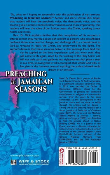 ""So, what am I hoping to accomplish with this publication of my sermons, Preaching in Jamaican Seasons?"" Author and cleric Devon Dick hopes that readers will hear the prophetic voice, the therapeutic voice, and the teaching voice in these homiletical formulations and, more importantly, that readers will hear the voice of our Saviour Jesus, the Christ, speaking to our hearts and minds. Revd Dr Dick explains further that this compilation of his sermons is offered so that they may be a source of comfort to persons who are afflicted, confront those who need to change, and challenge all to a commitment to God as revealed in Jesus, the Christ, and empowered by the Spirit. The author's desire is that these sermons deliver a clear message from God that can be applied to the lived experience; and that when read, they will come to life again, aided by the working of the Holy Spirit, and will not only teach and guide us into righteousness but plant a seed in our lives, knowing that it will accomplish that which God wills, as He gives it the increase beyond anything the author himself could dream of or envision.