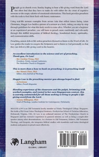 People go to church every Sunday hoping to hear a life-giving word from the Lord but often find that they have to make do with either the dry crust of cognitive sermons or the empty calories of emotional exhortations. This book provides preachers with the tools to feed their flock with hearty sustenance. Using real-life sermon examples from across Asia that reflect issues facing Asian Christians, Maggie Low builds a picture of a sermon as a body, taking you step-by-step through guidelin