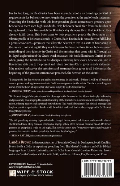 For far too long, the Beatitudes have been misunderstood as a daunting checklist of requirements for believers to meet to gain the promises at the end of each statement. Preaching the Beatitudes with this interpretation places unnecessary pressure upon believers to meet such high standards. Help believers break free from the burden of trying to make their lives match the Beatitudes by showing them that, in Christ, they already fulfill them. This book aims to help preachers preach the Beatitudes as a vibrant profile of believers already in Christ. Each Beatitude is not a duty to fulfill, but a promise to claim--promises that allow the believer to live in a state of flourishing in the present, not waiting till they reach heaven. In these perilous times, believers need reminding of their identity in Christ and the promises that come with it. Through an in-depth exploration of the Greek word makarios, this book illuminates Christ's intent when giving the Beatitudes to his disciples, showing how every believer can live in flourishing state due to the present and future promises Christ gives in each statement. May readers rediscover the promises and assurance Jesus gives to all believers at the beginning of the greatest sermon ever preached, the Sermon on the Mount.