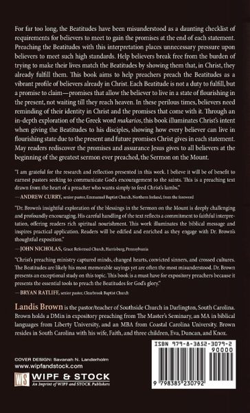 For far too long, the Beatitudes have been misunderstood as a daunting checklist of requirements for believers to meet to gain the promises at the end of each statement. Preaching the Beatitudes with this interpretation places unnecessary pressure upon believers to meet such high standards. Help believers break free from the burden of trying to make their lives match the Beatitudes by showing them that, in Christ, they already fulfill them. This book aims to help preachers preach the Beatitudes as a vibrant profile of believers already in Christ. Each Beatitude is not a duty to fulfill, but a promise to claim--promises that allow the believer to live in a state of flourishing in the present, not waiting till they reach heaven. In these perilous times, believers need reminding of their identity in Christ and the promises that come with it. Through an in-depth exploration of the Greek word makarios, this book illuminates Christ's intent when giving the Beatitudes to his disciples, showing how every believer can live in flourishing state due to the present and future promises Christ gives in each statement. May readers rediscover the promises and assurance Jesus gives to all believers at the beginning of the greatest sermon ever preached, the Sermon on the Mount.