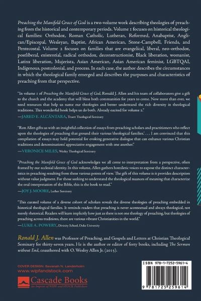 Preaching the Manifold Grace of God is a two-volume work describing theologies of preaching from the historical and contemporary periods. Volume 1 focuses on historical theological families: Orthodox, Roman Catholic, Lutheran, Reformed, Anabaptist, Anglican/Episcopal, Wesleyan, Baptist, African American, Stone-Campbell, Friends, and Pentecostal. Volume 2 focuses on families that are evangelical, liberal, neo-orthodox, postliberal, existential, radical orthodox, deconstructionist, Black liberation, womanist, Latinx liberation, Mujerista, Asian American, Asian American feminist, LGBTQAI, Indigenous, postcolonial, and process. In each case, the author describes the circumstances in which the theological family emerged and describes the purposes and characteristics of preaching from that perspective.
