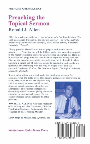 This book offers a practical model for developing sermons for occasions when the Bible offers little specific guidance for interpreting an issue, need, or situation. Ronald Allen describes why and how topical sermons should be used, discusses special occasions when they are appropriate, and outlines strategies for developing topical sermons, giving particular attention to controversial issues. The last chapter includes sample sermons by other preachers.
