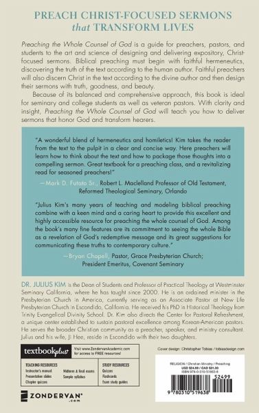 In Preaching the Whole Counsel of God, Julius Kim aids preachers and speakers with the necessary principles and practices to interpret and deliver effective expository, Christ-centered sermons and messages that honor God and transform hearers.