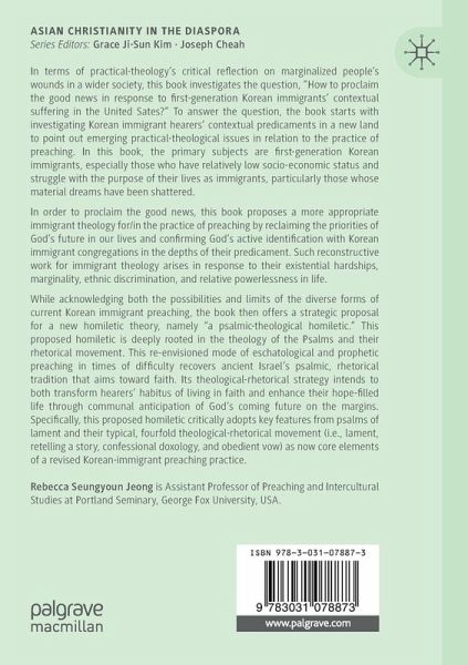 While acknowledging both the possibilities and limits of the diverse forms of current Korean immigrant preaching, the book then offers a strategic proposal for a new homiletic theory, namely "a psalmic-theological homiletic." This proposed homiletic is deeply rooted in the theology of the Psalms and their rhetorical movement. This re-envisioned mode of eschatological and prophetic preaching in times of difficulty recovers ancient Israel's psalmic, rhetorical tradition that aims toward faith. Its theological-rhetorical strategy intends to both transform hearers' habitus of living in faith and enhance their hope-filled life through communal anticipation of God's coming future on the margins. Specifically, this proposed homiletic critically adopts key features from psalms of lament and their typical, fourfold theological-rhetorical movement (i.e., lament, retelling a story, confessional doxology, and obedient vow) as now core elements of a revised Korean-immigrant preaching practice.