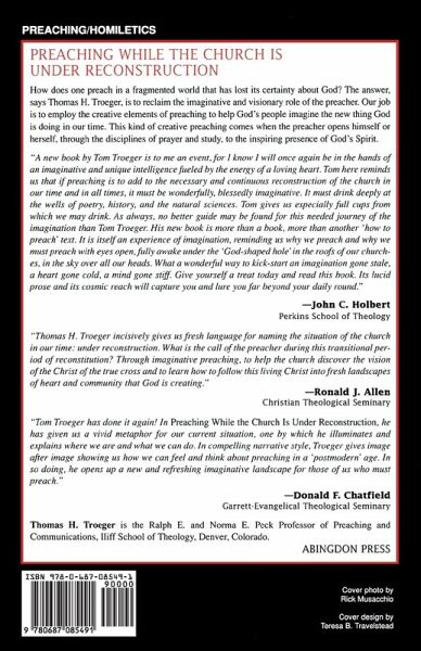 In the parable that begins this book, a large chunk has fallen out of the roof of a historic church, exactly where an imposing mosaic of God enthroned in heaven used to reside. The members of the church, unable to agree on how to repair the roof or what image to put there, now worship under a God-shaped hole, trying to come to grips with the loss of old certitudes and the new challenges they face. The church today faces exactly the same problem, argues Thomas Troeger. We live in a fragmented society, and the church reflects that fragmentation. We, too, sit under the "God-shaped hole," wondering how to proceed now that former ways of understanding who God is and what it means to be God's people are no longer universally or even widely held. How does one preach in this situation? The answer, says Troeger, is to reclaim the imaginative and visionary role of the preacher. The preacher's job is to employ the creative elements of preaching to help God's people imagine the new thing God is doing in our time. Yet this kind of creative preaching is not just a matter of technique, of learning the right methods for how to preach with imagination. It is foremost a matter of formation; it comes when the preacher opens himself or herself, through the disciplines of prayer and study, to the inspiring presence of God's Spirit. In Preaching While the Church Is Under Reconstruction, Troeger constructs a framework for how to preach in this time of transition and failing certainties. He demonstrates that, enlivened by the work of God's Spirit, it is possible to preach with vision and insight, and help God's people perceive their place in the world which God is creating anew.