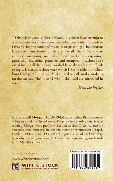 ""If there is any excuse for this book, it is that it is an attempt to answer a question that I have been asked, certainly hundreds of times during the course of my work of preaching. The question has taken many forms, but it is essentially the same. It is an enquiry concerning methods of preparation in expository preaching. Individual preachers and groups of preachers have asked me to tell them how I work. I have always felt it difficult to reply. During the three years which I was President of Cheshunt College, Cambridge, I attempted to talk to the students on the subject. The notes of what I then said are embodied in these Lectures."" -From the Preface