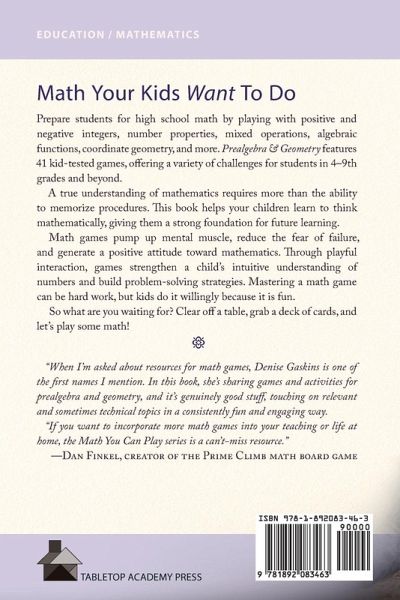 Prepare students for high school math by playing with positive and negative integers, number properties, mixed operations, algebraic functions, coordinate geometry, and more. Prealgebra & Geometry features 41 kid-tested games, offering a variety of challenges for students in 4-9th grades and beyond. A true understanding of mathematics requires more than the ability to memorize procedures. This book helps your children learn to think mathematically, giving them a strong foundation for future learning. Chapters include:Number Properties: Master factors, multiples, prime numbers, and logical deduction. Integers: Explore the workings of positive and negative numbers. Operations and Functions: Stretch your mental muscles with games that require algebraic thinking. Geometry: Play around with area, perimeter, coordinate graphing, and more. Math games pump up mental muscle, reduce the fear of failure, and generate a positive attitude toward mathematics. Through playful interaction, games strengthen a child's intuitive understanding of numbers and build problem-solving strategies. Mastering a math game can be hard work, but kids do it willingly because it is fun. So what are you waiting for? Clear off a table, grab a deck of cards, and let's play some math!