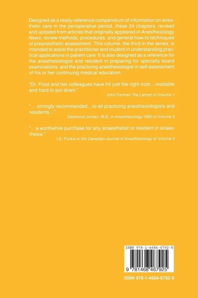 One of the easiest things an anesthesiologist can do is to administer an anesthetic, and therein lies one of the major dangers of anesthesia. Like in flying and diving, if the rules are followed, mishaps should be very rare. The Art of Anesthesiology so often depends on anticipation of the unexpected, knowing the patient and doing something intelligent when the Science does not give a clear cut answer to a problem. The risks to our patients can, therefore, be markedly reduced, if we have a good grasp of the difficulties and dilemmas that they are prone to, before they are anesthetized. Herein lies the great value of preanesthetic assessment. Preanesthetic Assessment has now reached its third volume in the space of five years. Twenty-four new areas are covered with more than enough detailed information to satisfy the careful practitioner and the Board Examiner. Dr. Elizabeth Frost is to be congratulated on presenting a breadth of material that contains something useful and informative for everyone in training or practice. Subjects vary from the demands of the athlete to those of the Jehovah 's Witness, congenital disorders to pediatric and obstetrical quandaries. Other problem areas include drug abuse, endocrinology, the patient undergoing neuroradiology and a mixed bag of diseases that provide the unprepared anesthesiologist with problems.