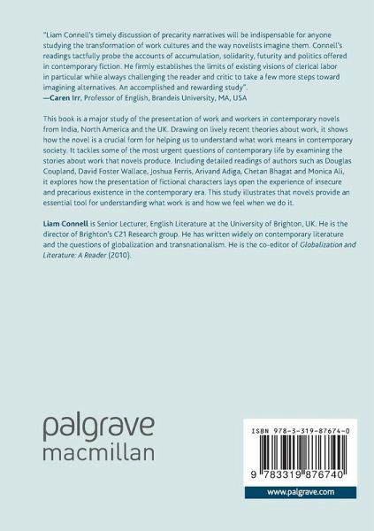This book is a major study of the presentation of work and workers in contemporary novels from India, North America and the UK. Drawing on lively recent theories about work, it shows how the novel is a crucial form for helping us to understand what work means in contemporary society. It tackles some of the most urgent questions of contemporary life by examining the stories about work that novels produce. Including detailed readings of authors such as Douglas Coupland, David Foster Wallace, Joshua Ferris, Arivand Adiga, Chetan Bhagat and Monica Ali it explores how the presentation of fictional characters lays open the experience of insecure and precarious existence in the contemporary era. This study illustrates that novels provide an essential tool for understanding what work is and how we feel when we do it.