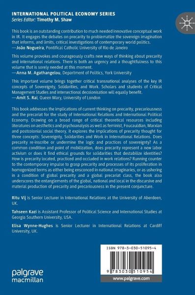 This book addresses the implications of current thinking on precarity, precariousness and the precariat for the study of International Relations and International Political Economy. Drawing on a broad range of critical theoretical resources including literatures on aesthetics and psychoanalysis as well as feminist, Foucauldian, Marxian and postcolonial social theory, it explores the implications of precarity thought for three concepts: Sovereignty, Solidarities and Work in International Relations. Does precarity re-inscribe or undermine the logic and practices of sovereignty? As a common condition and point of mobilization, does precarity represent a new labor activism or does it find ethical grounds for solidarities that destabilize identities? How is precarity located, practiced and occluded in work relations? Running counter to the contemporary impulse to grasp precarity and processes of its proliferation in homogenized terms as either being ensconced in national imaginaries, or asushering in a condition of global precarity and a global precariat class, the book also underscores the entanglements of the global, national and local in the discursive and material production of precarity and precariousness in the present conjuncture.