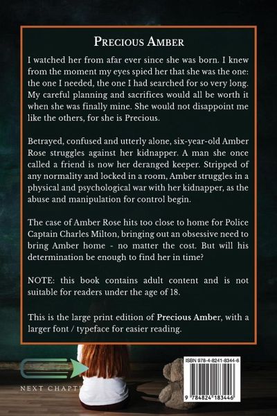 I watched her from afar ever since she was born. I knew from the moment my eyes spied her that she was the one: the one I needed, the one I had searched for so very long. My careful planning and sacrifices would all be worth it when she was finally mine. She would not disappoint me like the others, for she is Precious. Betrayed, confused and utterly alone, six-year-old Amber Rose struggles against her kidnapper. A man she once called a friend is now her deranged keeper. Stripped of any normality and locked in a room, Amber struggles in a physical and psychological war with her kidnapper, as the abuse and manipulation for control begin. The case of Amber Rose hits too close to home for Police Captain Charles Milton, bringing out an obsessive need to bring Amber home - no matter the cost. But will his determination be enough to find her in time? This is the large print edition of Precious Amber, with a larger font / typeface for easier reading.