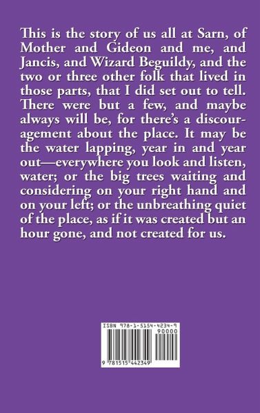 This is the story of us all at Sarn, of Mother and Gideon and me, and Jancis, and Wizard Beguildy, and the two or three other folk that lived in those parts, that I did set out to tell. There were but a few, and maybe always will be, for there’s a discouragement about the place. It may be the water lapping, year in and year out—everywhere you look and listen, water; or the big trees waiting and considering on your right hand and on your left; or the unbreathing quiet of the place, as if it was created but an hour gone, and not created for us.