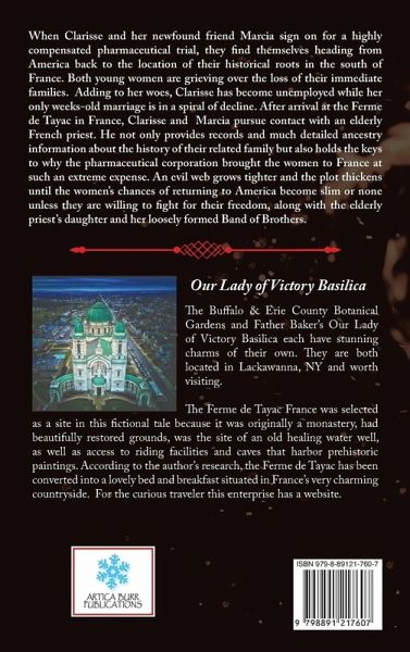 When Clarisse and her newfound friend Marcia sign on for a highly compensated pharmaceutical trial, they find themselves heading from America back to the location of their historical roots in the south of France. Both young women are grieving over the loss of their immediate families. Adding to her woes, Clarisse has become unemployed while her only weeks-old marriage is in a spiral of decline. After arrival at the Ferme de Tayac in France, Clarisse and Marcia pursue contact with an elderly French priest. He not only provides records and much detailed ancestry information about the history of their related family but also holds the keys to why the pharmaceutical corporation brought the women to France at such an extreme expense. An evil web grows tighter and the plot thickens until the women's chances of returning to America become slim or none unless they are willing to fight for their freedom, along with the elderly priest's daughter and her loosely formed Band of Brothers.