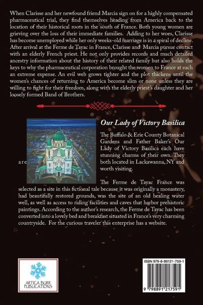 When Clarisse and her newfound friend Marcia sign on for a highly compensated pharmaceutical trial, they find themselves heading from America back to the location of their historical roots in the south of France. Both young women are grieving over the loss of their immediate families. Adding to her woes, Clarisse has become unemployed while her only weeks-old marriage is in a spiral of decline. After arrival at the Ferme de Tayac in France, Clarisse and Marcia pursue contact with an elderly French priest. He not only provides records and much detailed ancestry information about the history of their related family but also holds the keys to why the pharmaceutical corporation brought the women to France at such an extreme expense. An evil web grows tighter and the plot thickens until the women's chances of returning to America become slim or none unless they are willing to fight for their freedom, along with the elderly priest's daughter and her loosely formed Band of Brothers.