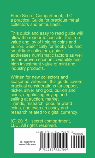 From Secret Compartment, LLC - a practical Guide for precious metal collectors and enthusiasts. This quick and easy to read guide will allow the reader to consider the true value and joy of holding coins and bullion. Specifically for hobbyists and small time collectors, guide addresses numismatic factors as well as the proven economic viability and high investment value of mint and industry products. Written for new collectors and seasoned veterans, this guide covers practical considerations for copper, nickel, silver and gold, bullion and coins, negotiating buying and selling at auction, market Trends, research, popular world coins, and even an essay and research related to digital currency. (C) 2015 - secret compartment, LLC. All rights reserved.