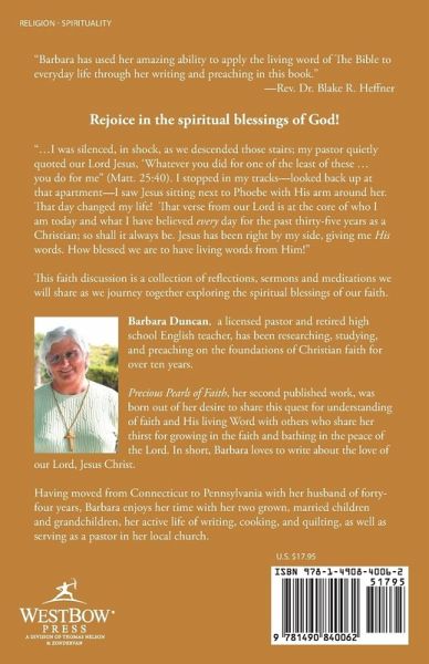 ?Barbara has used her amazing ability to apply the living word of The Bible to everyday life through her writing and preaching in this book.? ?Rev. Dr. Blake R. Heffner Rejoice in the spiritual blessings of God! ??I was silenced, in shock, as we descended those stairs; my pastor quietly quoted our Lord Jesus, ?Whatever you did for one of the least of these ?you do for me? (Matt. 25:40). I stopped in my tracks?looked back up at that apartment?I saw Jesus sitting next to Phoebe with His arm around her. That day changed my life! That verse from our Lord is at the core of who I am today and what I…mehr