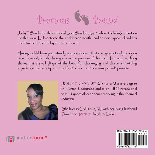 Jody P. Sanders is the mother of Laila Sanders, age 3, who is the living inspiration for this book. Laila entered the world three months earlier than expected and has been taking the world by storm ever since. Having a child born prematurely is an experience that changes not only how you view the world, but also how you view the process of childbirth. In this book, Jody shares just a small glimps of the beautiful, challenging and character building experience that is unique to the life of a newborn "precious pound" preemie.