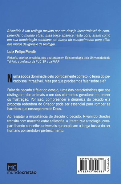 Numa época dominada pelo politicamente correto, o tema do pecado soa intragável. Mas por que precisamos falar sobre ele? Falar de pecado é falar do desejo, uma das características que nos distinguem dos animais e um dos elementos geradores de prazer ou frustração. Por isso, compreender a dinâmica do pecado e a proposta redentora do Criador pode ser essencial para romper as barreiras que nos separam de Deus. Ao resgatar a importância de discutir o pecado, Rivanildo Guedes transita com maestria entre a filosofia, a literatura e a teologia, compartilhando conceitos universais que explicam a longa busca do ser humano por sentido e pertencimento.