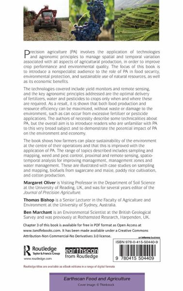 Margaret Oliver is a Visiting Professor in the Department of Soil Science at the University of Reading, UK, and was for several years editor of the Journal of Precision Agriculture. Thomas Bishop is Senior Lecturer in the Faculty of Agriculture and Environment at the University of Sydney, Australia. Ben Marchant is an Environmental Scientist at the British Geological Survey and was previously at Rothamsted Research, Harpenden, UK.