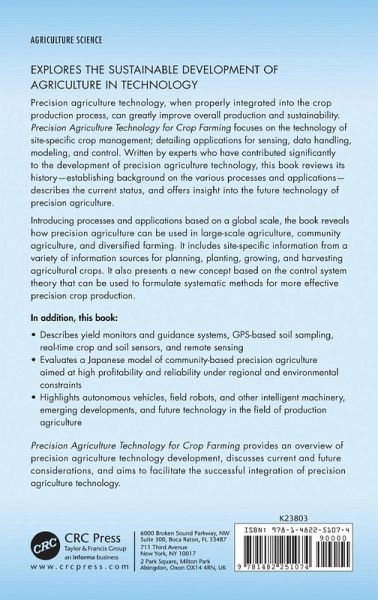 Explores the Sustainable Development of Agriculture in Technology Precision agriculture technology, when properly integrated into the crop production process, can greatly improve overall production and sustainability. Precision Agriculture Technology for Crop Farming focuses on the technology of site-specific crop management; detailing applications for sensing, data handling, modeling, and control. Written by experts who have contributed significantly to the development of precision agriculture technology, this book reviews its history-establishing background on the various processes and applications-describes the current status, and offers insight into the future technology of precision agriculture. Introducing processes and applications based on a global scale, the book reveals how precision agriculture can be used in large-scale agriculture, community agriculture, and diversified farming. It includes site-specific information from a variety of information sources for planning, planting, growing, and harvesting agricultural crops. It also presents a new concept based on the control system theory that can be used to formulate systematic methods for more effective precision crop production. In addition, this author: Describes yield monitors and guidance systems, GPS-based soil sampling, real-time crop and soil sensors, and remote sensing Evaluates a Japanese model of community-based precision agriculture aimed at high profitability and reliability under regional and environmental constraints Highlights autonomous vehicles, field robots, and other intelligent machinery, emerging developments, and future technology in the field of production agriculture Precision Agriculture Technology for Crop Farming provides an overview of precision agriculture technology development, discusses current and future considerations, and aims to facilitate the successful integration of precision agriculture technology.