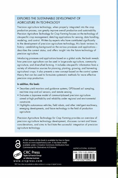 Explores the Sustainable Development of Agriculture in Technology Precision agriculture technology, when properly integrated into the crop production process, can greatly improve overall production and sustainability. Precision Agriculture Technology for Crop Farming focuses on the technology of site-specific crop management; detailing applications for sensing, data handling, modeling, and control. Written by experts who have contributed significantly to the development of precision agriculture technology, this book reviews its history-establishing background on the various processes and applications-describes the current status, and offers insight into the future technology of precision agriculture. Introducing processes and applications based on a global scale, the book reveals how precision agriculture can be used in large-scale agriculture, community agriculture, and diversified farming. It includes site-specific information from a variety of information sources for planning, planting, growing, and harvesting agricultural crops. It also presents a new concept based on the control system theory that can be used to formulate systematic methods for more effective precision crop production. In addition, this author: Describes yield monitors and guidance systems, GPS-based soil sampling, real-time crop and soil sensors, and remote sensing Evaluates a Japanese model of community-based precision agriculture aimed at high profitability and reliability under regional and environmental constraints Highlights autonomous vehicles, field robots, and other intelligent machinery, emerging developments, and future technology in the field of production agriculture Precision Agriculture Technology for Crop Farming provides an overview of precision agriculture technology development, discusses current and future considerations, and aims to facilitate the successful integration of precision agriculture technology.