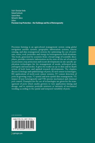 Spatial and Temporal Heterogeneity of Crops, Pests, Diseases and Weeds - Causes and Implications.- Soil Heterogeneity and Crop Growth.- Spatial and Temporal Dynamics of Weed Weeds Epidemiology Weeds Distribution Populations.- Spatial and Temporal Dynamics of Plant Pathogens.- Spatial and Temporal Dynamics of ArthropodsArthropods in Arable Fields.- Sensing and Sensor Technologies in Crop Protection.- The Use of Laboratory Spectroscopy and Optical Remote Sensing for Estimating Soil Properties.- Sensing of Photosynthetic Activity of Crops.- Remote Sensing for Precision Crop Protection - A Matter of Scale.- Detection and Identification of Weeds.- Detection of Fungal Diseases Optically and Pathogen Inoculum by Air Sampling.- Remote Sensing for the Detection of Soil-Borne Plant Parasitic Nematodes and Fungal Pathogens.- Potential of Digital ThermographyThermography for Disease Control.- Geographical Approaches for Integrated Pest ManagementIntegrated Pest Management of Arthropods in ForestryForestry and Row Crops.- Modelling and Decision Support Systems.- Spatial Data Handling and Management.- Decision Rules for Site-Specific Weed Management.- Modelling Plant Diseases Modelling Plant Diseases for Decision Making in Crop Protection.- Model Validation and Use of Geographic Information Systems in Crop Protection Warning Service.- Application Technologies for Site-Specific Crop Protection.- Mechanical Weed ControlMechanical weed control .- Direct InjectionDirect Injection Sprayer.- Delivery Optimization for PesticidesPesticides .- Autonomous SystemsAutonomous Systems for Plant Protection.- Variable Rate Technology for Herbicide Applicationherbicide application .- Variable Rate ApplicationVariable rate application of Fungicides.- Current Use of Precision CropProtection in Practice.- Providing Precision Crop and Range Protection in the US Northern Great Plains.- Site-Specific Detection and Management of Nematodes.- Precision Disease Control in Bed-Grown Crops.- Economic Evaluation of Precision Crop Protection Measures.
