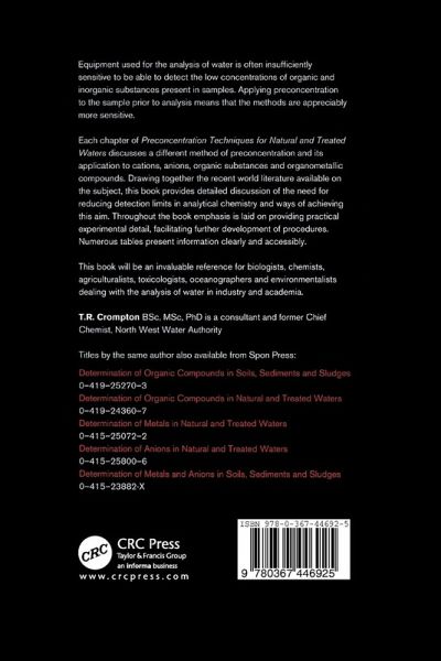 This book will be an invaluable reference for biologists, chemists, agriculturists, toxicologists, oceanographers, and environmentalists dealing with the analysis of water in industry and academia.