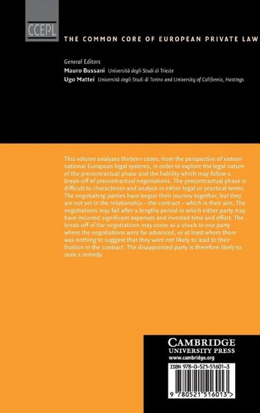 This volume analyses thirteen cases, from the perspective of sixteen national European legal systems, in order to explore the legal nature of the precontractual phase and the liability which may follow a break-off of precontractual negotiations. The precontractual phase is difficult to characterise and analyse in either legal or practical terms. The negotiating parties have begun their journey together, but they are not yet in the relationship - the contract - which is their aim. The negotiations may fail after a lengthy period in which either party may have incurred significant expenses and invested time and effort. The break-off of the negotiations may come as a shock to one party where the negotiations were far advanced, or at least where there was nothing to suggest that they were not likely to lead to their fruition in the contract. The disappointed party is therefore likely to seek a remedy.