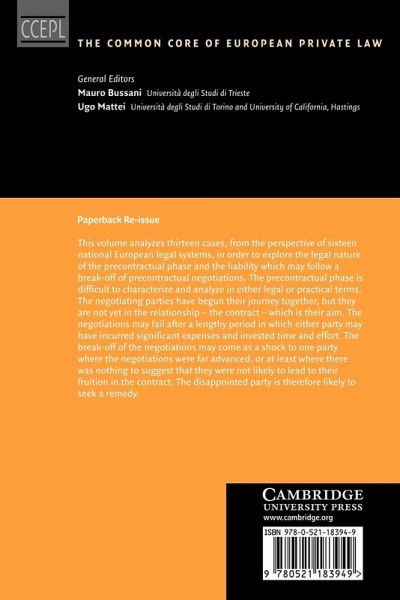 This volume analyses thirteen cases, from the perspective of sixteen national European legal systems, in order to explore the legal nature of the precontractual phase and the liability which may follow a break-off of precontractual negotiations. The precontractual phase is difficult to characterise and analyse in either legal or practical terms. The negotiating parties have begun their journey together, but they are not yet in the relationship - the contract - which is their aim. The negotiations may fail after a lengthy period in which either party may have incurred significant expenses and invested time and effort. The break-off of the negotiations may come as a shock to one party where the negotiations were far advanced, or at least where there was nothing to suggest that they were not likely to lead to their fruition in the contract. The disappointed party is therefore likely to seek a remedy.