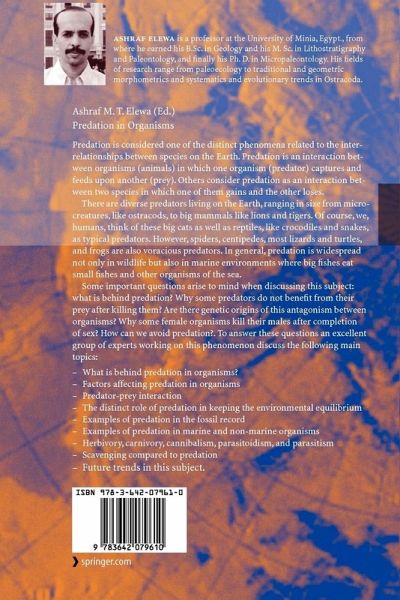 Some important questions arise to mind when discussing this subject: what is behind predation? Why some predators do not benefit from their prey after killing them? Are there genetic origins of this antagonism between organisms? Why some female organisms kill their males after completion of sex? How can we avoid predation? To answer these questions an excellent group of experts working on this phenomenon discuss the following main topics: What is behind predation in organisms? - Factors affecting predation in organisms - Predator-prey interaction - The distinct role of predation in keeping the environmental equilibrium - Examples of predation in the fossil record - Examples of predation in marine and non-marine organisms - Herbivory, carnivory, cannibalism, parasitoidism, and parasitism - Scavenging compared to predation - Future trends in this subject.