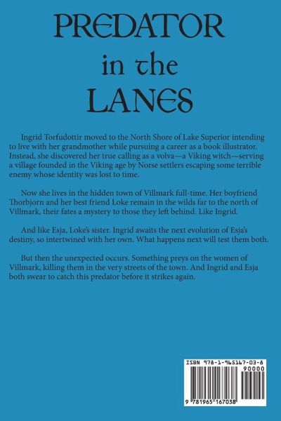 Ingrid Torfudottir moved to the North Shore of Lake Superior intending to live with her grandmother while pursuing a career as a book illustrator. Instead, she discovered her true calling as a volva-a Viking witch-serving a village founded in the Viking age by Norse settlers escaping some terrible enemy whose identity was lost to time. Now she lives in the hidden town of Villmark full-time. Her boyfriend Thorbjorn and her best friend Loke remain in the wilds far to the north of Villmark, their fates a mystery to those they left behind. Like Ingrid. And like Esja, Loke's sister. Ingrid awaits the next evolution of Esja's destiny, so intertwined with her own. What happens next will test them both. But then the unexpected occurs. Something preys on the women of Villmark, killing them in the very streets of the town. And Ingrid and Esja both swear to catch this predator before it strikes again.