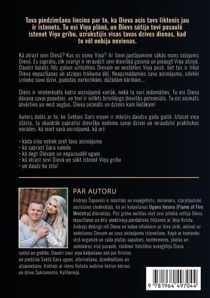 Tava piedzim¿ana liecina par to, ka Dieva ac¿s tavs liktenis jau ir ¿stenots. Tu esi Vi¿a pl¿n¿, un Dievs s¿t¿ja tevi pasaul¿ ¿stenot Vi¿a gribu, uzrakst¿jis visas tavas dz¿ves dienas, kad to v¿l nebija nevienas. K¿ atrast sevi Diev¿? Kas es esmu Vi¿¿? Ar ¿iem jaut¿jumiem s¿k¿s mans ce¿ojums Diev¿. Es sapratu, cik svar¿gi ir ieraudz¿t sevi dievi¿¿¿ gaism¿ un pieaugt Vi¿a atzi¿¿. Daudzi baid¿s l¿dz galam uztic¿ties Dievam un nost¿ties Vi¿a pus¿, bet tas ir tikai Dieva nepaz¿¿anas un atzi¿as tr¿kuma d¿¿. Neapzin¿damies savu aicin¿jumu, cilv¿ki iznieko savu dz¿vi, padodas narkotik¿m, dä¿d¿m k¿r¿b¿m... Dievs ir ieinteres¿ts katra aicin¿jum¿ vair¿k, nek¿ tu vari iedom¿ties. Tu esi Dieva d¿vana savai paaudzei, un tev¿ ir ielikts br¿ni¿¿¿gs dievi¿¿s potenci¿ls. Tu esi aicin¿ts atv¿rties un nest aug¿us, Dieva aicin¿ts un dzimis kam liel¿kam! Autors dal¿s ar to, ko Sv¿tais Gars vi¿am ir m¿c¿jis daudzu gadu gait¿. Izlasot vi¿a st¿stu, tu skaidr¿k saprat¿si dievi¿¿o nodomu savai dz¿vei un ieraudz¿si praktiskas nor¿des, k¿ ieiet sav¿ aicin¿jum¿, k¿ ar¿: k¿da c¿¿a notiek pret tavu aicin¿jumu k¿ saprast Gara valodu k¿ degt Dievam un nepazaud¿t uguni k¿ atrast sevi Diev¿ un s¿kt ¿stenot Vi¿a gribu un daudz ko citu Par autoruAndrejs ¿apovals ir m¿c¿t¿js un evä¿¿lists, mision¿rs, starptautiski paz¿stams sludin¿t¿js, k¿ ar¿ kalpöanas Uguns liesma (Flame of Fire Ministry) dibin¿t¿js. P¿c gr¿ku nö¿las vi¿¿ sevi piln¿b¿ velt¿ja Dieva iepaz¿¿anai un dr¿z piedz¿voja p¿rdabisku tik¿anos ar J¿zu Kristu. Andrejs dedz¿gi m¿l Dievu un kalpo cilv¿kiem ar t¿va sirdi, aicinot uz nodöanos Dievam un sava aicin¿juma ¿stenöanu. Kop¿ ar komandu vi¿¿ organiz¿ un vada pläas sapulces, konferences, skolas un semin¿rus vis¿ pasaul¿, sludinot Valst¿bas evä¿¿liju Dieva sp¿k¿ un god¿b¿. Daudzi caur vi¿a kalpöanu n¿k pie Kristus un piedz¿vo Sv¿t¿ Gara uguni, atbr¿vöanu, dziedin¿¿anu un atjaunöanu. Andrejs ar sievu Natäu audzina ¿etrus b¿rnus un dz¿vo Sakramento, Kalifornij¿.
