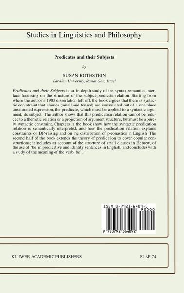 Predicates and their Subjects is an in-depth study of the syntax-semantics interface focusing on the structure of the subject-predicate relation. Starting from where the author's 1983 dissertation left off, the book argues that there is syntactic constraint that clauses (small and tensed) are constructed out of a one-place unsaturated expression, the predicate, which must be applied to a syntactic argument, its subject. The author shows that this predication relation cannot be reduced to a thematic relation or a projection of argument structure, but must be a purely syntactic constraint. Chapters in the book show how the syntactic predication relation is semantically interpreted, and how the predication relation explains constraints on DP-raising and on the distribution of pleonastics in English. The second half of the book extends the theory of predication to cover copular constructions; it includes an account of the structure of small clauses in Hebrew, of the use of `be' in predicative and identity sentences in English, and concludes with a study of the meaning of the verb `be'.