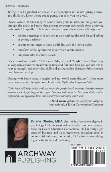 Trying to sell a product or service to a corporation is like navigating a maze: You think you know where you're going, but then you hit a wall. Duane Glader, MBA, has spent almost forty years in sales, and he guides you through the twists and turns that prevent corporate salespeople from achieving their goals. His specific techniques and street smart observations will help you: schedule meetings with decision makers without the need for cold calling or getting a referral; take important steps to boost credibility with the right people; transform verbal agreements into written commitments; jumpstart sales that have stalled. Glader also decodes when "Yes" means "Maybe" , and "Maybe" means "No", why all corporate executives are driven by time and fear (and how you can use this to your advantage), and the critical skills and attributes that all successful salespeople must have or develop. Oozing with battle-tested strategies and real-world examples, you'll close more sales than you ever thought possible with the Predictable Corporate Sales. "This book will help rookie and seasoned sales professionals manage through complex decision cycles by picking up the right clues and indicators to close more deals, and as important, not squander time and resources on ones they won't win." -David Gahn, president, Corporate Graphics International, a Taylor Corporation Company