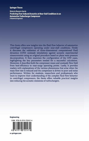 This thesis offers new insights into the fluid flow behavior of automotive centrifugal compressors operating under near-stall conditions. Firstly it discusses the validation of three-dimensional computational fluid dynamics (CFD) unsteady simulations against acoustic experimental measurements using an original procedure based on plane wave pressure decomposition. It then examines the configuration of the CFD cases, highlighting the key parameters needed for a successful calculation. Moreover, it describes both the compressor mean and unsteady flow field from best-efficiency to near-surge operating points. Lastly, it provides readers with explanations of the various phenomena that arise when the mass flow rate is reduced and the compressor is driven to poor and noisy performance. Written for students, researchers and professionals who want to improve their understanding of the complex fluid flow behavior in centrifugal compressors, the thesis offers valuable practical insights into reducing the acoustic emissions of turbochargers.