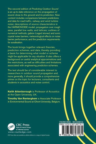 The second edition of Predicting Outdoor Sound is an up-to-date reference on the propagation of sound close to the ground and its prediction. New content includes comparisons between predictions and data for road traffic, railway and wind turbine noise; descriptions of source characteristics in the HARMONOISE model; propagation over rough seas, parallel low walls, and lattices; outlines of numerical methods; gabion (caged stones) and sonic crystal noise barriers; meteorological effects on noise barrier performance; and the prediction requirements for auralization.