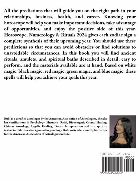 All the predictions that will guide you on the right path in your relationships, business, health, and career. Knowing your horoscope will help you make important decisions, take advantage of opportunities, and enjoy the positive side of this year. Horoscope, Numerology & Rituals 2024 gives each zodiac sign a complete synthesis of their upcoming year. You should use these predictions so that you can avoid obstacles or find solutions to unavoidable circumstances. In this book you will find ancient rituals, amulets, and spiritual baths described in detail, easy to perform, and the materials available are at hand. Based on white magic, black magic, red magic, green magic, and blue magic, these spells will help you achieve your goals this year.