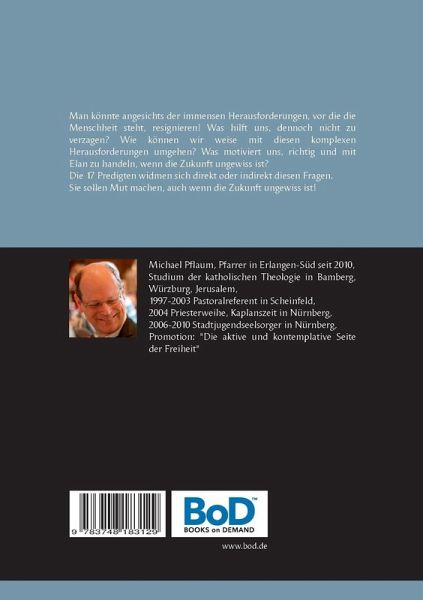 Man könnte angesichts der immensen Herausforderungen, vor denen die Menschheit steht, resignieren! Was hilft uns, dennoch nicht zu verzagen? Wie können wir weise mit diesen komplexen Herausforderungen umgehen? Was motiviert uns, richtig und mit Elan zu handeln, wenn die Zukunft ungewiss ist?Die 17 Predigten widmen sich direkt oder indirekt diesen Fragen. Sie sollen Mut machen, auch wenn die Zukunft ungewiss ist!