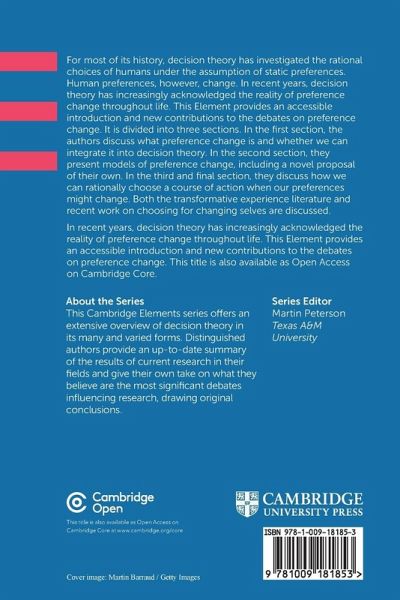 In recent years, decision theory has increasingly acknowledged the reality of preference change throughout life. This Element provides an accessible introduction and new contributions to the debates on preference change.