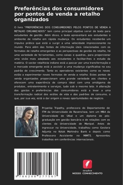 O livro ¿PREFERÊNCIAS DOS CONSUMIDORES PELOS PONTOS DE VENDA A RETALHO ORGANIZADOS¿ tem como principal objetivo servir de texto para estudantes de gestão. Além disso, o texto apresentará aos estudantes o ambiente de retalho em rápida mudança. Os estudantes receberão um impulso prático que está a surgir a uma velocidade impressionante no mundo. Para além das fontes de informação úteis relacionadas com os formatos de retalho emergentes e as perspectivas de gestão do retalho, há uma variedade de ferramentas, como caixas e quadros, para proporcionar uma visão mais adaptada aos estudantes e facilitar-lhes o estudo da matéria. O sector retalhista indiano está a passar por uma transformação e o mercado emergente está a assistir a uma mudança significativa no seu padrão de crescimento. Tanto os operadores existentes como os novos estão a experimentar novos formatos de venda a retalho. Estes pontos de venda organizados proporcionam uma grande variedade aos clientes e oferecem uma experiência de compra ideal com uma amálgama de produtos, entretenimento e serviços, tudo sob o mesmo teto. A alteração dos gostos e preferências dos consumidores está a levar a uma transformação radical dos estilos de vida e dos padrões de consumo, o que, por sua vez, está a dar origem a novas oportunidades de negócio.