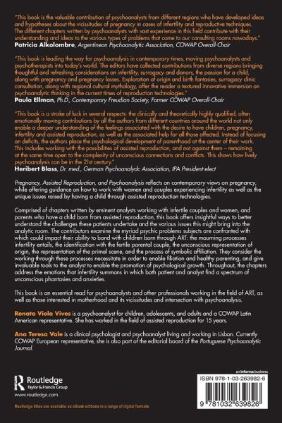 This book is the valuable contribution of psychoanalysts from different regions who have developed ideas and hypotheses about the vicissitudes of pregnancy in cases of infertility and reproductive techniques. The different chapters written by psychoanalysts with vast experience in this field contribute with their understanding and ideas to the various types of problems that come to our consulting rooms nowadays.