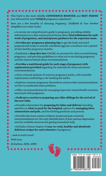 Pregnancy, Childbirth & Your Newborn Simplified is the most reliable CONFIDENCE BOOSTER and BEST FRIEND you will need for your UNIQUE pregnancy experience! Here are a few benefits of choosing Pregnancy, Childbirth & Your Newborn Simplified over other books: 1. * A concise yet comprehensive guide to pregnancy, providing reliable information in a clear and practical format about fetal milestones for each week of pregnancy, and anticipatory guidance for the expectant mom. * Provides pre-pregnancy planning tips to get the body and mind prepared and ready to nourish a fertilized egg into a newborn over a period of nine healthy pregnancy months. * Facilitates a deep dive into TACOS, an acronym for what to avoid during pregnancy, and provides guidelines on what not to eat during pregnancy and the reasons behind these recommendations. * Provides a pregnancy nutritional guide for each stage of pregnancy with explanations provided regarding the rationale for these nutritional recommendations. * Gives a factual analysis of common pregnancy myths, with scientific explanations confirming or de-bunking the myths. * Explores common pregnancy discomforts and provides recommendations on how to ameliorate these problems. * Offers recommendations for managing crucial mental health concerns associated with pregnancy such as post-partum depression. * Dedicates a section to preparing any older siblings for the arrival of the new baby. * Provides information for preparing for labor and delivery, including specifics on what to pack for the hospital, options for managing labor contractions and pain, and the birthing positions and process. * Provides the most current evidence-based and peer-reviewed recommendations for the early identification of post-partum depression and the available resources for getting immediate help. * Includes a bonus chapter of easy-to-cook, healthy, and absolutely delicious pregnancy recipes for each trimester of pregnancy. ...and so much more! With love, JK Karliese, MSN, APRN