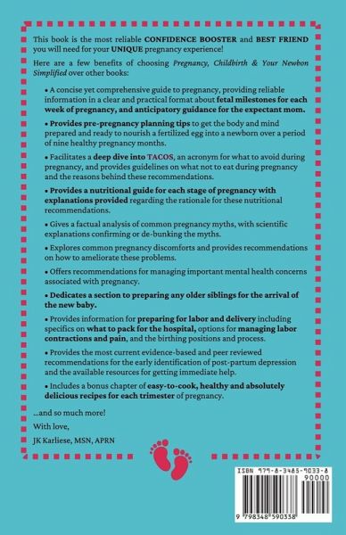 Pregnancy, Childbirth & Your Newborn Simplified is the most reliable CONFIDENCE BOOSTER and BEST FRIEND you will need for your UNIQUE pregnancy experience! Here are a few benefits of choosing Pregnancy, Childbirth & Your Newborn Simplified over other books: 1. * A concise yet comprehensive guide to pregnancy, providing reliable information in a clear and practical format about fetal milestones for each week of pregnancy, and anticipatory guidance for the expectant mom. * Provides pre-pregnancy planning tips to get the body and mind prepared and ready to nourish a fertilized egg into a newborn over a period of nine healthy pregnancy months. * Facilitates a deep dive into TACOS, an acronym for what to avoid during pregnancy, and provides guidelines on what not to eat during pregnancy and the reasons behind these recommendations. * Provides a pregnancy nutritional guide for each stage of pregnancy with explanations provided regarding the rationale for these nutritional recommendations. * Gives a factual analysis of common pregnancy myths, with scientific explanations confirming or de-bunking the myths. * Explores common pregnancy discomforts and provides recommendations on how to ameliorate these problems. * Offers recommendations for managing crucial mental health concerns associated with pregnancy. * Dedicates a section to preparing any older siblings for the arrival of the new baby. * Provides information for preparing for labor and delivery, including specifics on what to pack for the hospital, options for managing labor contractions and pain, and the birthing positions and process. * Provides the most current evidence-based and peer-reviewed recommendations for the early identification of post-partum depression and the available resources for getting immediate help. * Includes a bonus chapter of easy-to-cook, healthy, and absolutely delicious pregnancy recipes for each trimester of pregnancy. ...and so much more! With love, JK Karliese, MSN, APRN